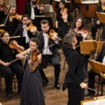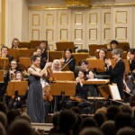 Die umjubelte Solistin erfreute das Publikum außerdem mit zwei temperamentvollen Duos von Béla Bartók (Nr. 21 und Nr. 32 der „44 Duos für Violinen“), die sie gemeinsam mit Konzertmeisterin Jelica Injac als Zugaben vor der Pause spielte.